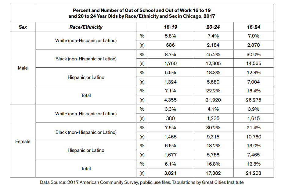 As of the latest data on out-of-school youth collected in Chicago, 30% of Black men aged 16-24 were unemployed, compared to 12.8% of Hispanic or Latino men and only 7% of white men in that age range.