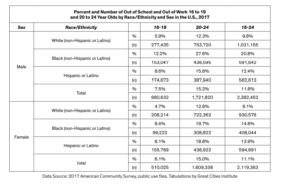 More information about the long term effects of disconnected youth’s socioeconomic mobility can be found here, as well as information on the benefit of remedial programs as one solution, though I would argue that we must be proactive if we truly want to pursue equity and assert that better education is integral to that.